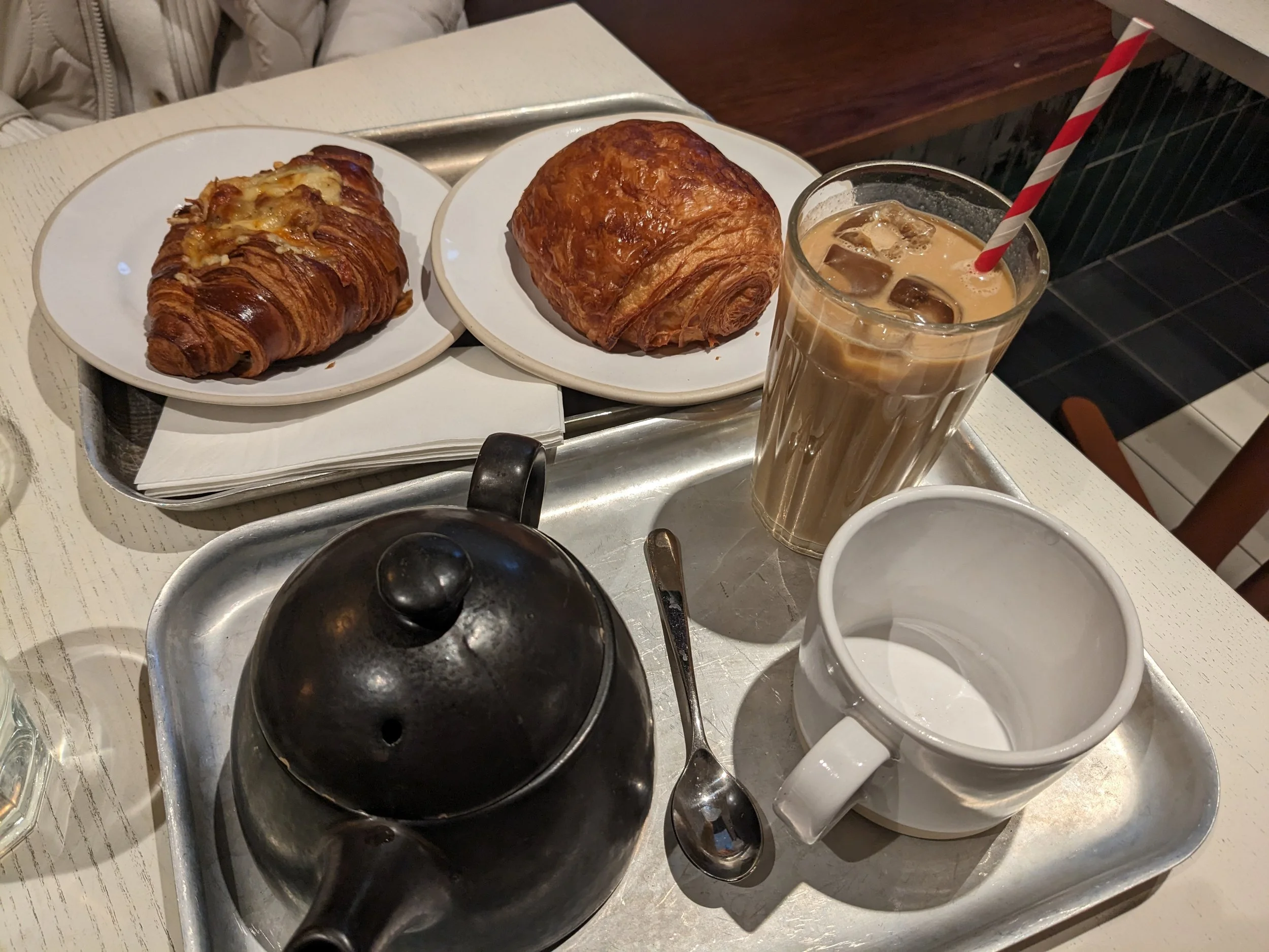Ham and cheese croissant next to a chocolate croissant. Oat milk latte served along with a pot of steeping mint tea.